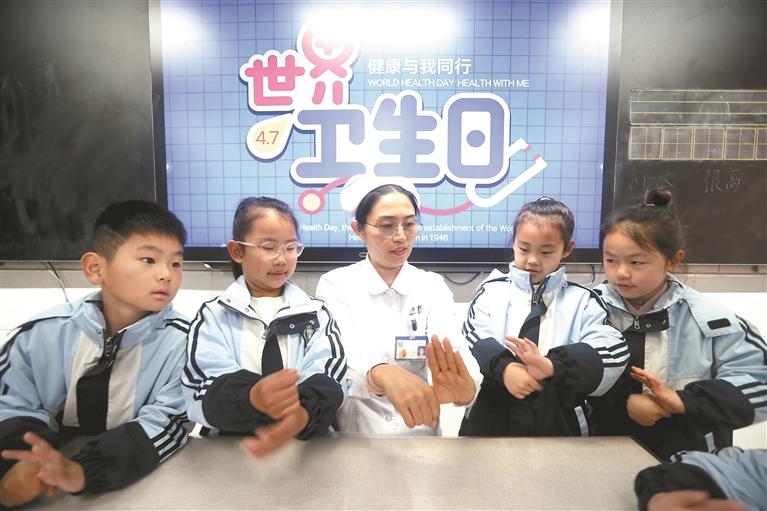 四月七日,在江苏省连云港市院前小学,医务人员给学生讲解“七步洗手法”。四月七日是世界卫生日,国家卫生健康委将今年中国宣传主题确定为“共享科技创新,携手共促健康”。 新华社发(王春摄)