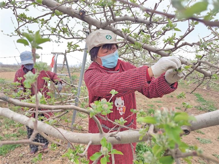 永寿县监军街道民丰村果农在果园疏花蕾(4月4日摄)。