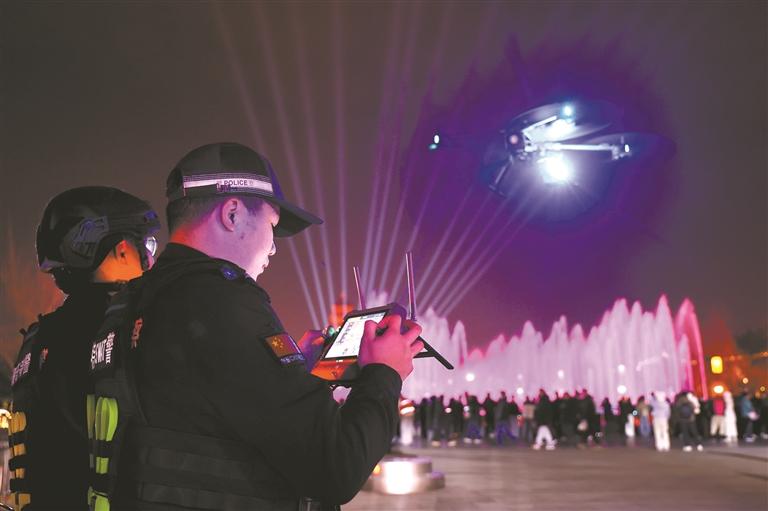 西安市公安局雁塔分局民警利用无人机夜巡大雁塔景区,织密安全网,守护万家灯火。 西安市公安局供图