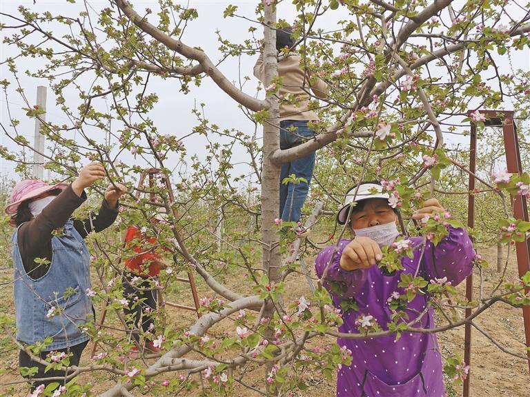 当前是果园管理的关键期,永寿县果农抢抓农时,开展预防病虫害、疏花作业,为今年苹果丰产打基础。图为近日,永寿县监军街道永安村果农在果园给苹果树疏花。 本报通讯员 李建龙摄