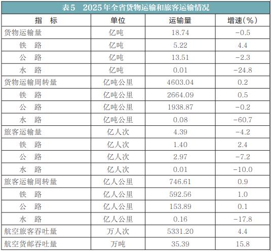 全年全省货物运输量18.74亿吨,比上年下降0.5%;货物运输周转量4603.04亿吨公里,增长0.2%。旅客运输量4.39亿人次,比上年下降4.2%;旅客运输周转量746.61亿人公里,增长0.9%。全省民航机场旅客吞吐量5331.2万人次,比上年增长4.4%,货邮吞吐量35.39万吨,增长15.8%。