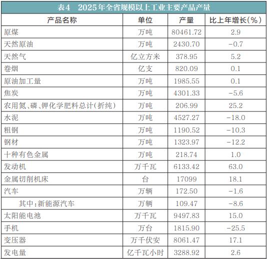 全年规模以上工业中,煤炭开采和洗选业增长10.8%,电力、热力生产和供应业增长5.5%,石油和天然气开采业增长4.3%,电气机械和器材制造业增长26.3%,汽车制造业增长20.2%,通用设备制造业增长10.2%,化学原料和化学制品制造业增长6.0%,专用设备制造业增长5.5%,有色金属冶炼和压延加工业增长5.3%,烟草制品业增长3.2%。