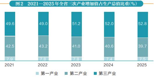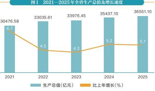 初步核算,全年全省地区生产总值36551.10亿元,比上年增长5.1%。其中,第一产业增加值2746.50亿元,增长3.8%,占生产总值的比重为7.5%;第二产业增加值14521.16亿元,增长5.6%,占生产总值的比重为39.7%;第三产业增加值19283.44亿元,增长4.9%,占生产总值的比重为52.8%。人均生产总值92663元,比上年增长5.3%。