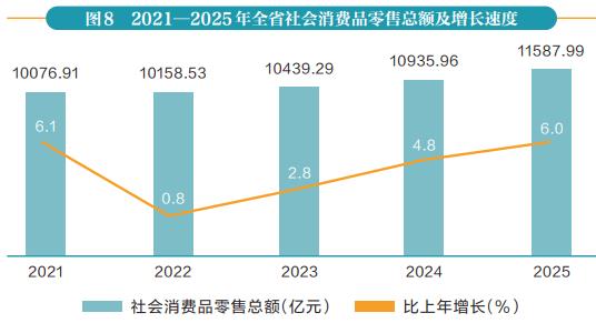 全年全省社会消费品零售总额11587.99亿元,比上年增长6.0%。按经营地分,城镇消费品零售额10276.54亿元,增长6.0%;乡村消费品零售额1311.45亿元,增长5.5%。按消费形态分,商品零售额10315.83亿元,增长6.2%;餐饮收入1272.16亿元,增长3.7%。