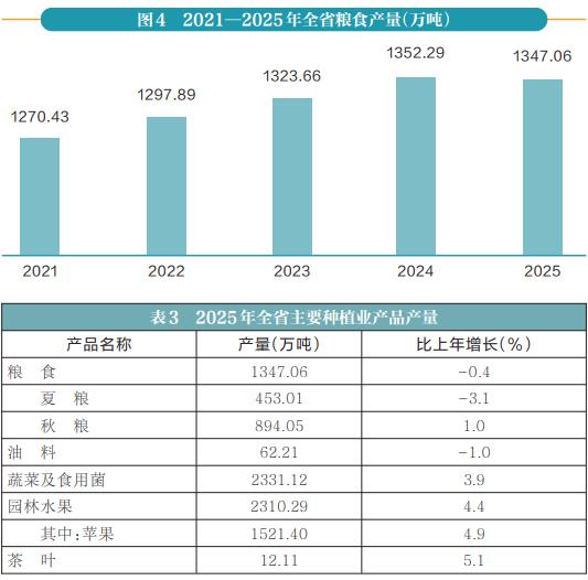 据抽样调查,全年全省粮食播种面积4567.87万亩,比上年增长0.4%。其中,夏粮1603.84万亩,增长0.2%;秋粮2964.03万亩,增长0.6%。全年粮食产量1347.06万吨,比上年下降0.4%。其中,夏粮产量453.01万吨,下降3.1%;秋粮产量894.05万吨,增长1.0%。全年园林水果产量2310.29万吨,比上年增长4.4%。其中,苹果产量1521.40万吨,增长4.9%。