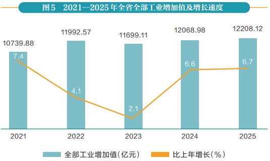 全年全省全部工业增加值12208.12亿元,比上年增长6.7%。规模以上工业增加值增长7.3%。在规模以上工业中,采矿业增加值比上年增长9.5%,制造业增长4.9%,电力、热力、燃气及水的生产和供应业增长4.8%。