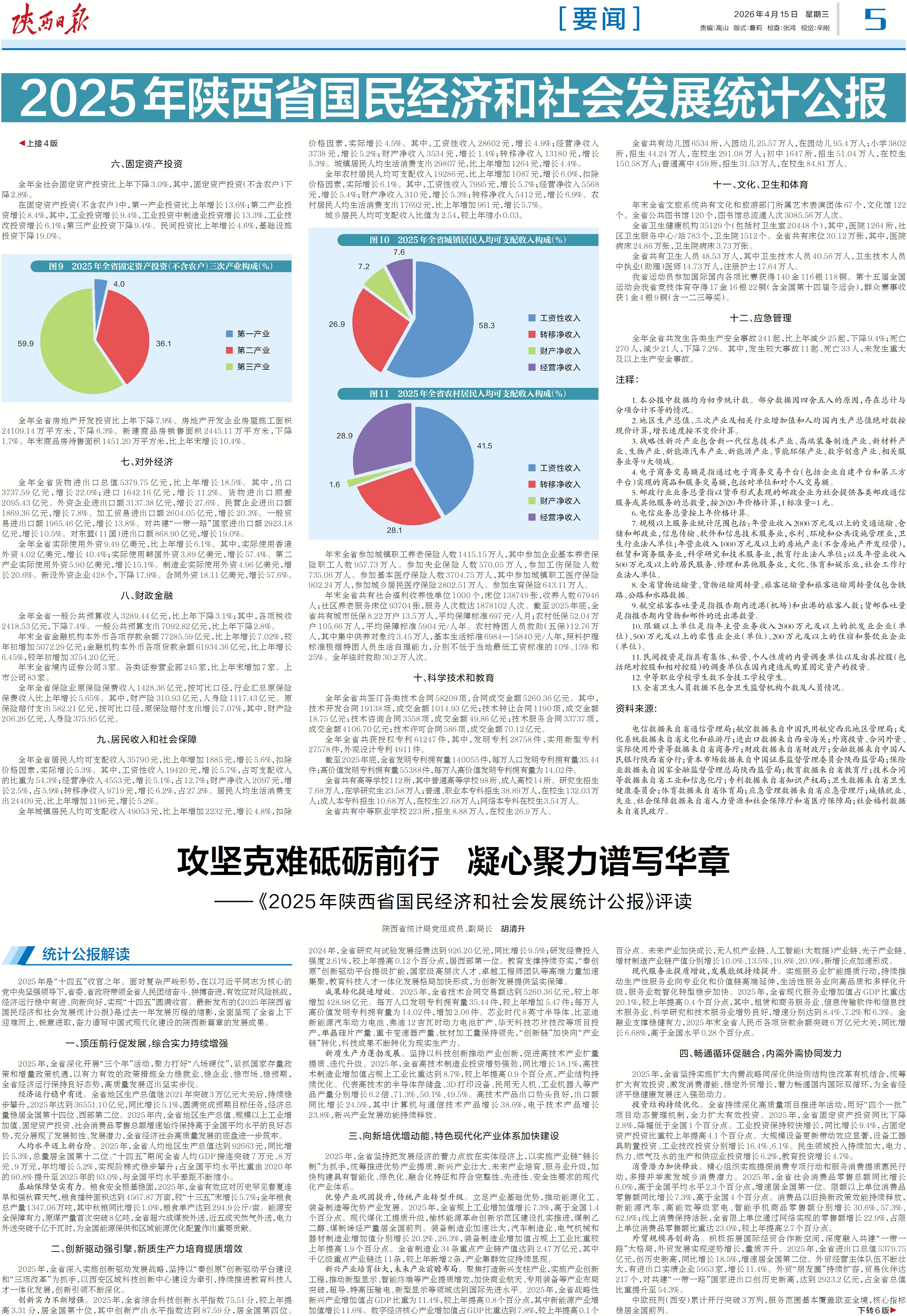 2025年是“十四五”收官之年,全省上下坚持以习近平新时代中国特色社会主义思想为指导,深入学习贯彻党的二十大和二十届历次全会精神,贯通落实习近平总书记历次来陕考察重要讲话重要指示,完整、准确、全面贯彻新发展理念,深化开展“三个年”活动、聚力打好“八场硬仗”,全省经济运行稳中有进、向新向好,高质量发展和现代化建设迈出坚实步伐,为“十五五”接续奋斗奠定了坚实基础。