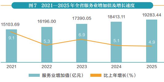 全年全省批发和零售业增加值3056.44亿元,比上年增长4.8%;交通运输、仓储和邮政业增加值1580.33亿元,增长5.1%;住宿和餐饮业增加值664.92亿元,增长4.7%;金融业增加值2200.56亿元,增长4.0%;房地产业增加值2071.31亿元,增长2.3%;信息传输、软件和信息技术服务业增加值1232.42亿元,增长7.2%;科学研究和技术服务业增加值1289.34亿元,增长6.3%;租赁和商务服务业增加值1462.20亿元,增长8.4%。规模以上服务业企业营业收入7061.82亿元,比上年增长4.8%。
