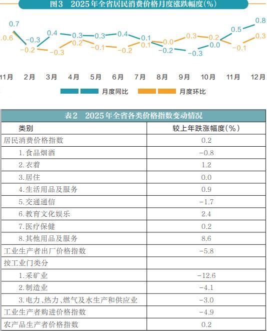 全年全省居民消费价格同比上涨0.2%。其中,城市上涨0.3%,农村下降0.1%;食品价格下降1.6%,非食品价格上涨0.6%;消费品价格下降0.2%,服务价格上涨0.8%。全年全省工业生产者出厂价格下降5.8%,工业生产者购进价格下降4.9%。