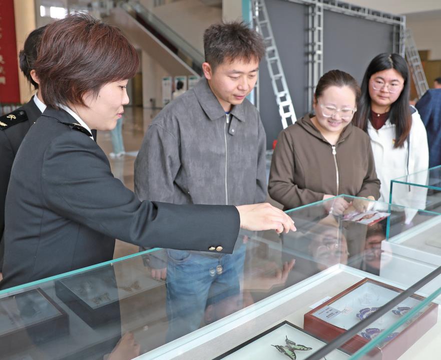 4月15日是第十一个全民国家安全教育日。4月14日,由西安海关、陕西省林业局主办的“清风护秦岭,国门筑屏障——共守国家生态安全”主题活动在商洛市秦岭博物馆举办。活动现场,西安海关向秦岭博物馆移交查获的珍贵生物标本1000多件,为秦岭博物馆“西安海关国门生物安全法治教育基地”揭牌。同时,为期3个月的国门生物安全特别展览启动。图为4月14日,西安海关关员给游客科普国门生物安全知识。 本报记者 文超摄