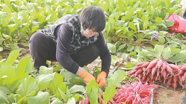 4月10日,定边县定边街道十里沙村的蔬菜大棚里,务工人员在采收水萝卜。 本报通讯员 马晓妮摄
