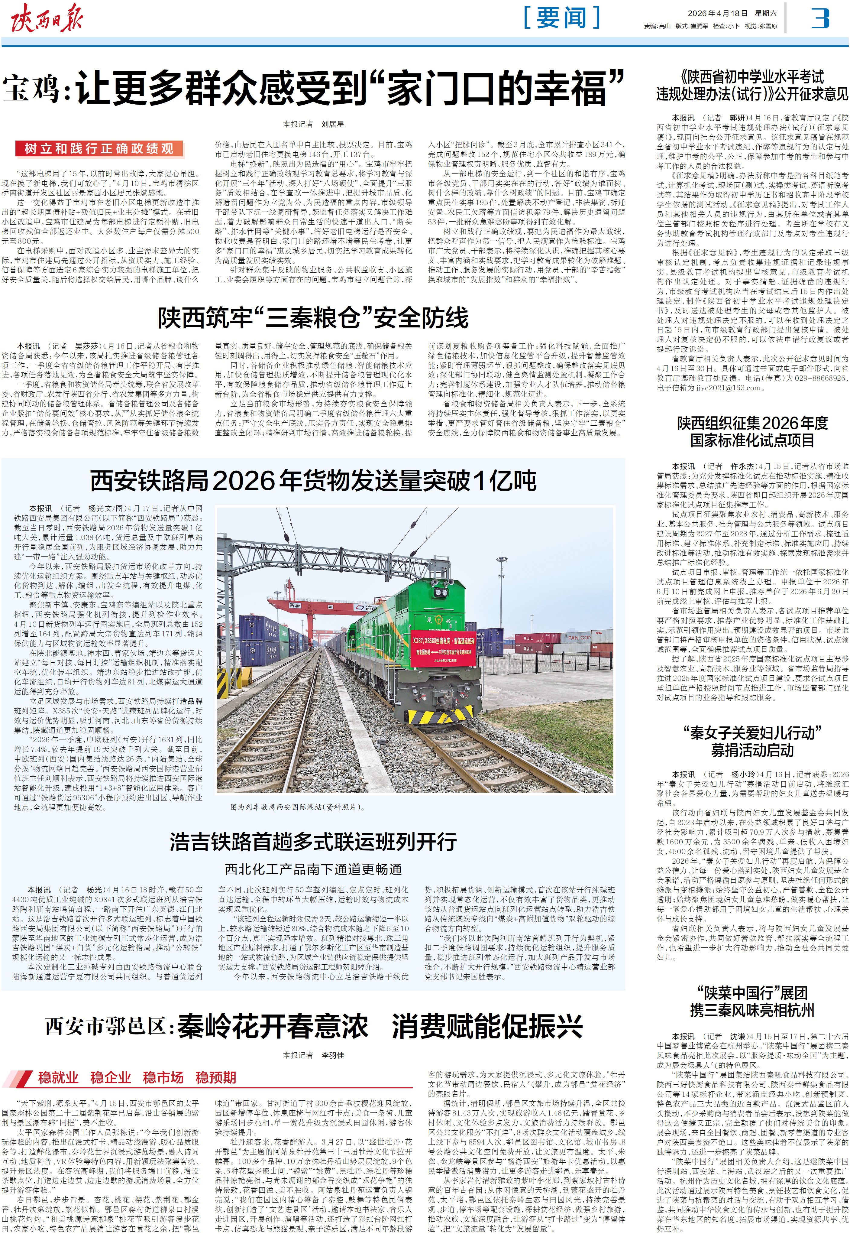 本报讯 (记者 仵永杰)4月15日,记者从省市场监管局获悉:为充分发挥标准化试点在推动标准实施、精准收集标准需求、总结推广先进经验等方面的作用,根据国家标准化管理委员会要求,陕西省即日起组织开展2026年度国家标准化试点项目征集推荐工作。
