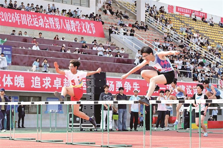 4月16日,西北农林科技大学2026年田径运动会暨第八届教学文化节开幕。本届运动会为期2天,分学生组和教职工组,设有多个竞赛项目。图为男子学生组110米栏决赛现场。 本报记者 杜玮摄
