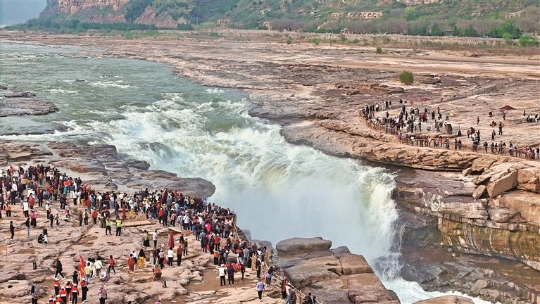 4月以来,黄河壶口瀑布迎来春季最佳观赏期。图为4月13日,游客在观景台上欣赏母亲河春日盛景。 本报记者 周恒宇摄