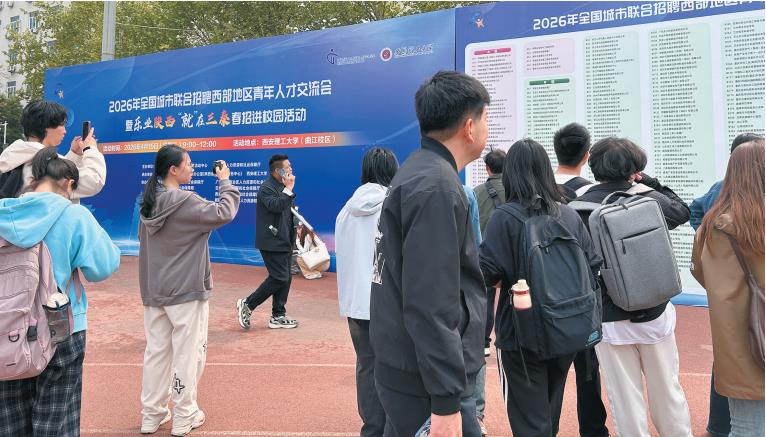 本报讯 (记者 周明文/图)4月15日,由人社部全国人才流动中心、省人社厅联合主办的2026年全国城市联合招聘西部地区青年人才交流会暨“乐业陕西‘就’在三秦”春招进校园活动在西安理工大学举办。