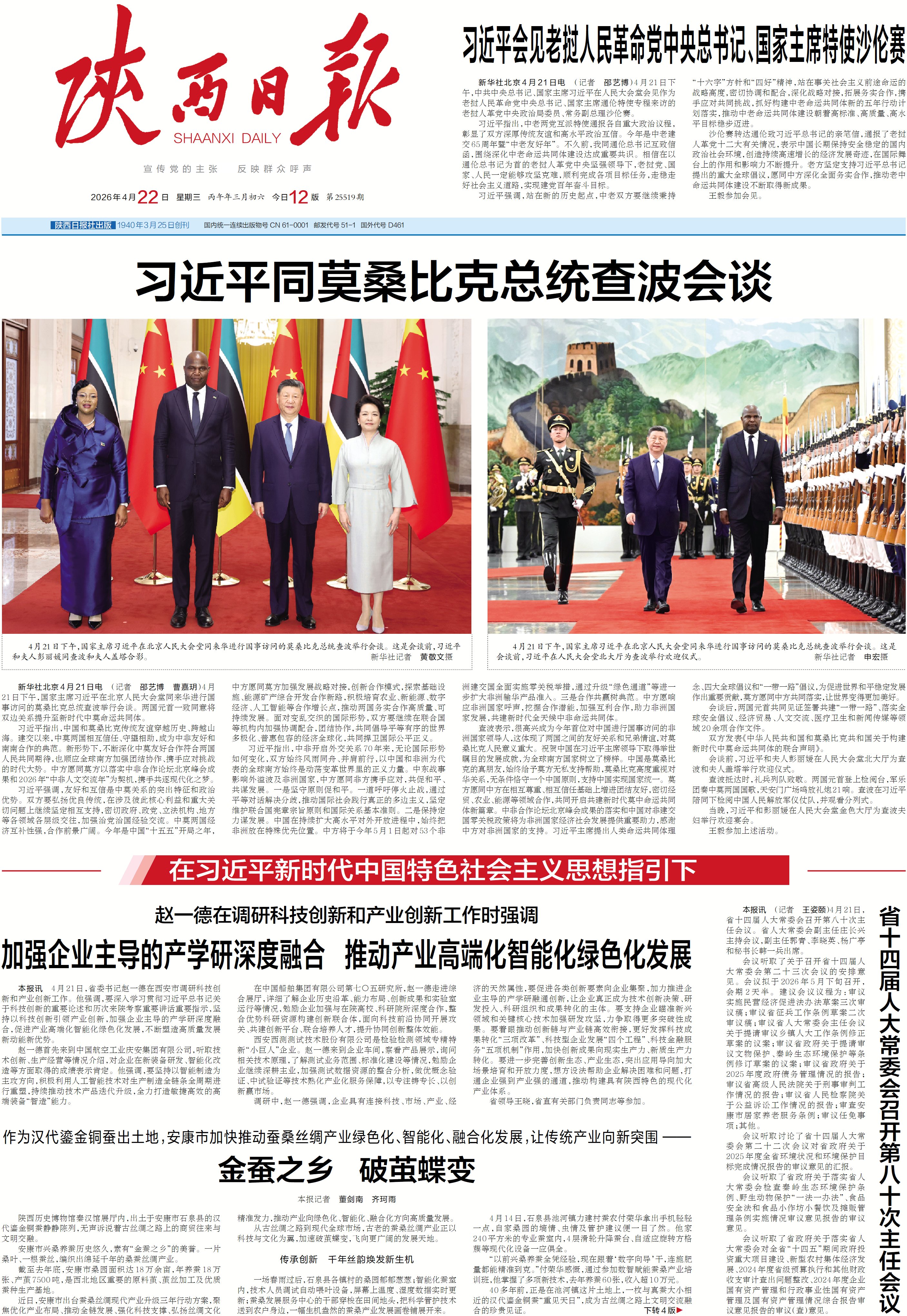 本报讯 4月21日,省委书记赵一德在西安市调研科技创新和产业创新工作。他强调,要深入学习贯彻习近平总书记关于科技创新的重要论述和历次来陕考察重要讲话重要指示,坚持以科技创新引领产业创新,加强企业主导的产学研深度融合,促进产业高端化智能化绿色化发展,不断塑造高质量发展新动能新优势。