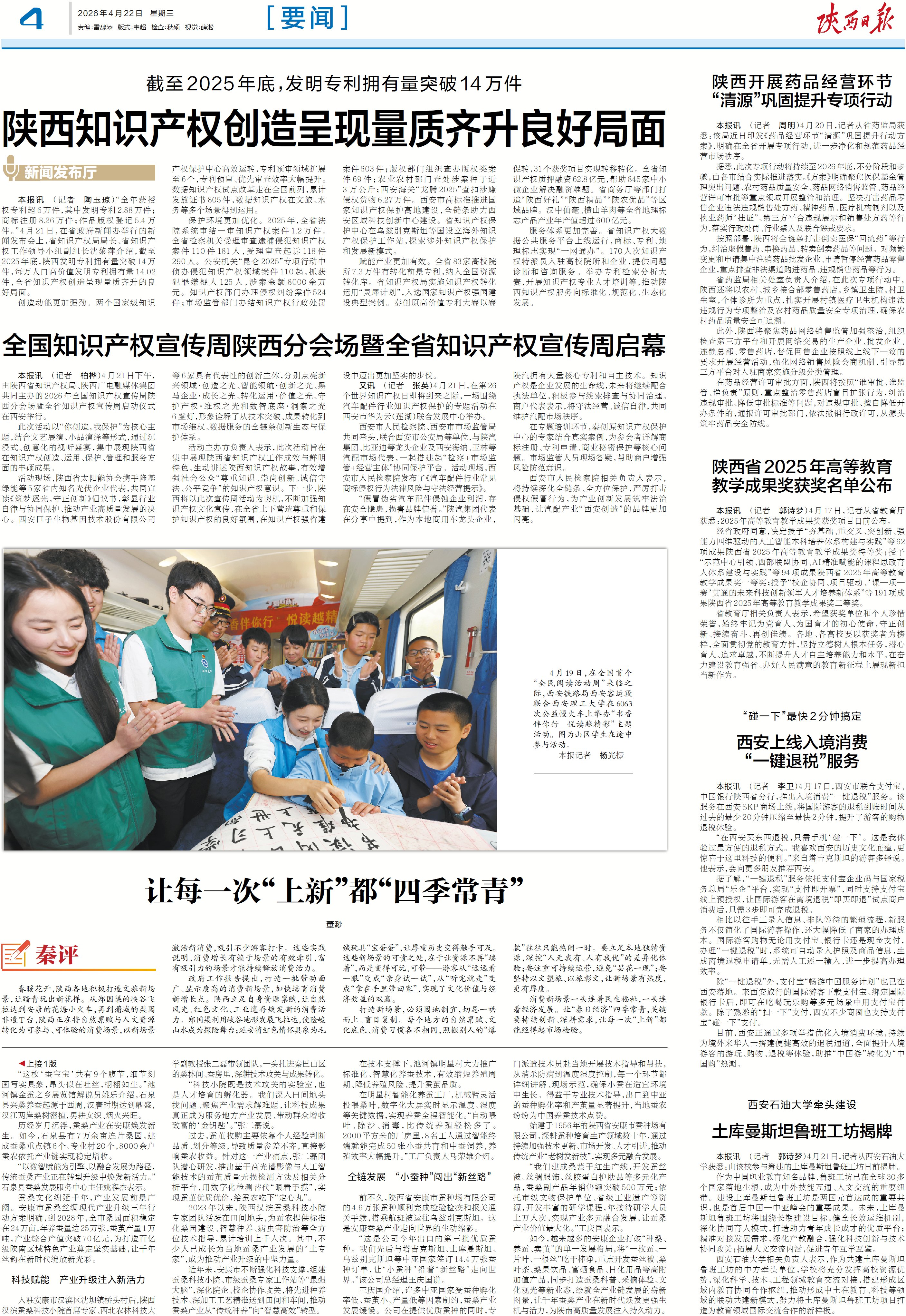本报讯 (记者 陶玉琼)“全年获授权专利超6万件,其中发明专利2.88万件;商标注册8.26万件;作品版权登记5.4万件。”4月21日,在省政府新闻办举行的新闻发布会上,省知识产权局局长、省知识产权工作领导小组副组长沈黎萍介绍,截至2025年底,陕西发明专利拥有量突破14万件,每万人口高价值发明专利拥有量14.02件,全省知识产权创造呈现量质齐升的良好局面。