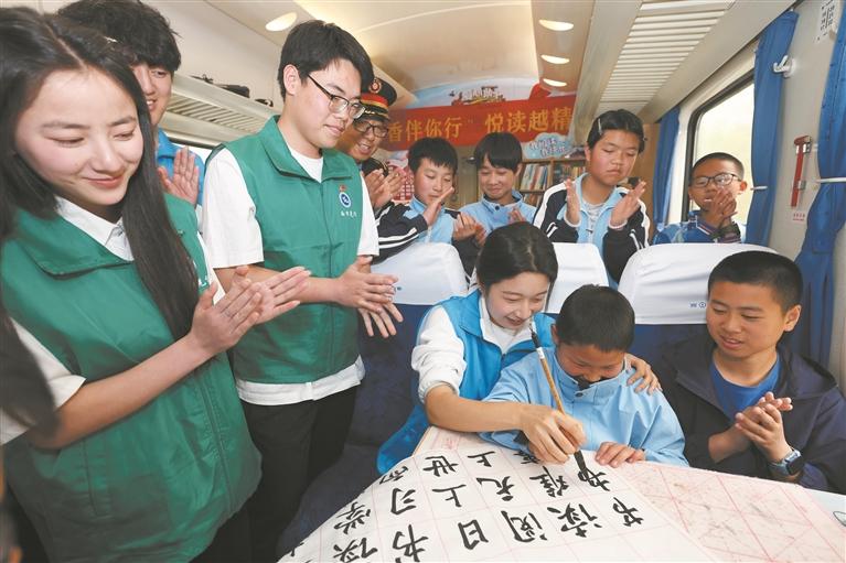 4月19日,在全国首个“全民阅读活动周”来临之际,西安铁路局西安客运段联合西安理工大学在6063次公益慢火车上举办“书香伴你行 悦读越精彩”主题活动。图为山区学生在途中参与活动。