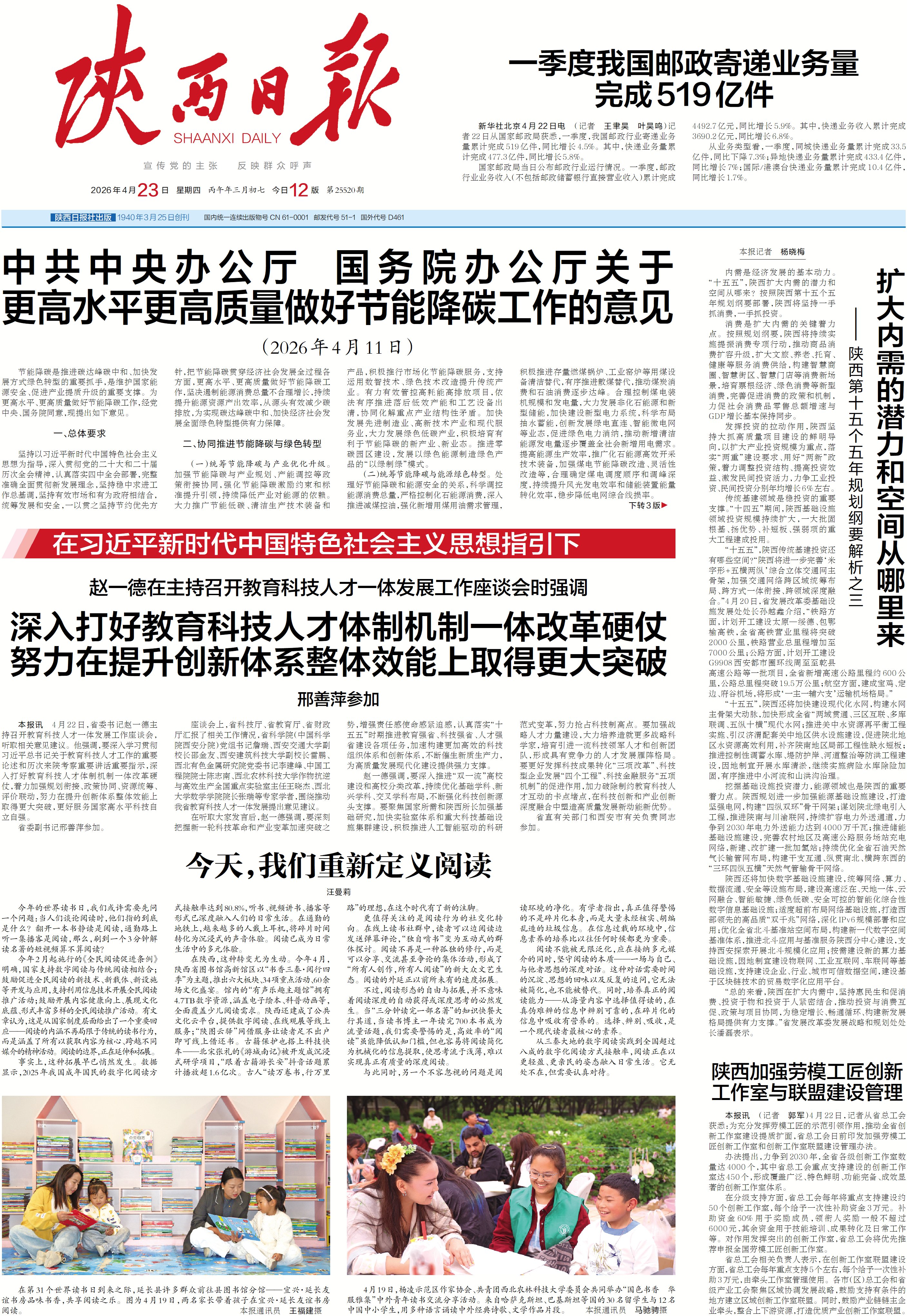 赵一德强调,要深入推进“双一流”高校建设和高校分类改革,持续优化基础学科、新兴学科、交叉学科布局,不断强化科技创新源头支撑。要聚焦国家所需和陕西所长加强基础研究,加快实验室体系和重大科技基础设施集群建设,积极推进人工智能驱动的科研范式变革,努力抢占科技制高点。要加强战略人才力量建设,大力培养造就更多战略科学家,培育引进一流科技领军人才和创新团队,形成具有竞争力的人才发展雁阵格局。要更好发挥科技成果转化“三项改革”、科技型企业发展“四个工程”、科技金融服务“五项机制”的促进作用,加力破除制约教育科技人才互动的卡点堵点,在科技创新和产业创新深度融合中塑造高质量发展新动能新优势。