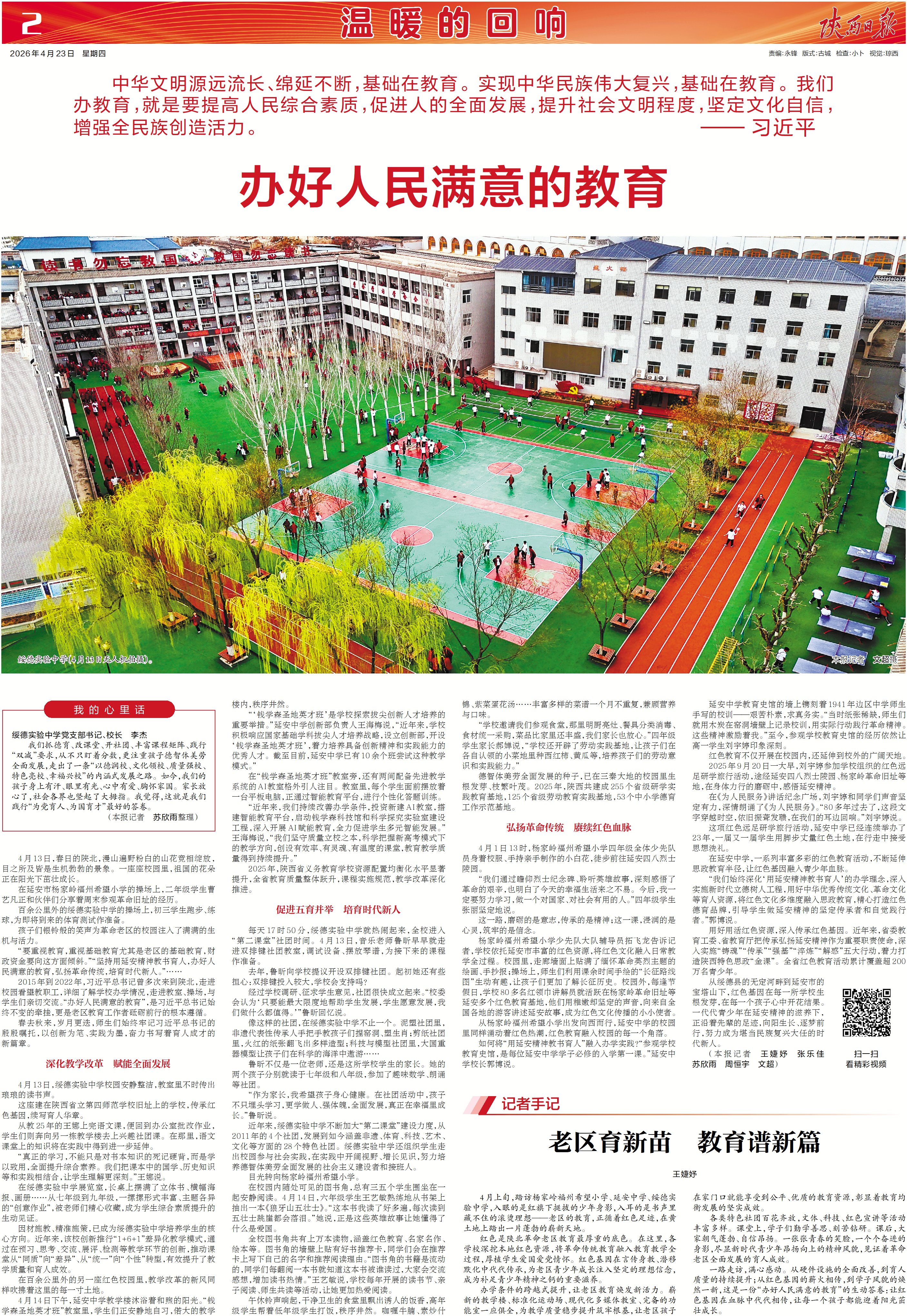 “要重视教育,重视基础教育尤其是老区的基础教育,财政资金要向这方面倾斜。”“坚持用延安精神教书育人,办好人民满意的教育,弘扬革命传统,培育时代新人。”……
