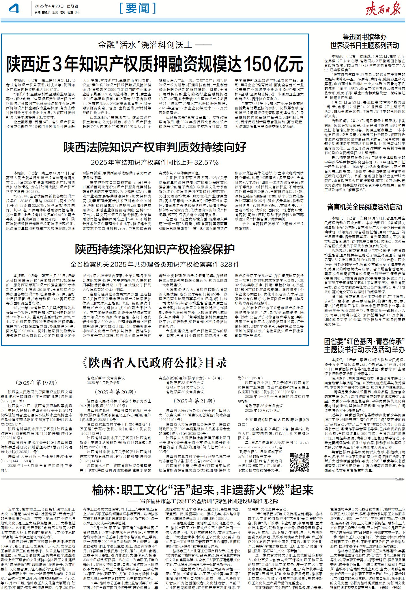 本报讯 (记者 陶玉琼)4月21日,记者从省知识产权局获悉:过去3年,陕西知识产权质押融资规模达150亿元。