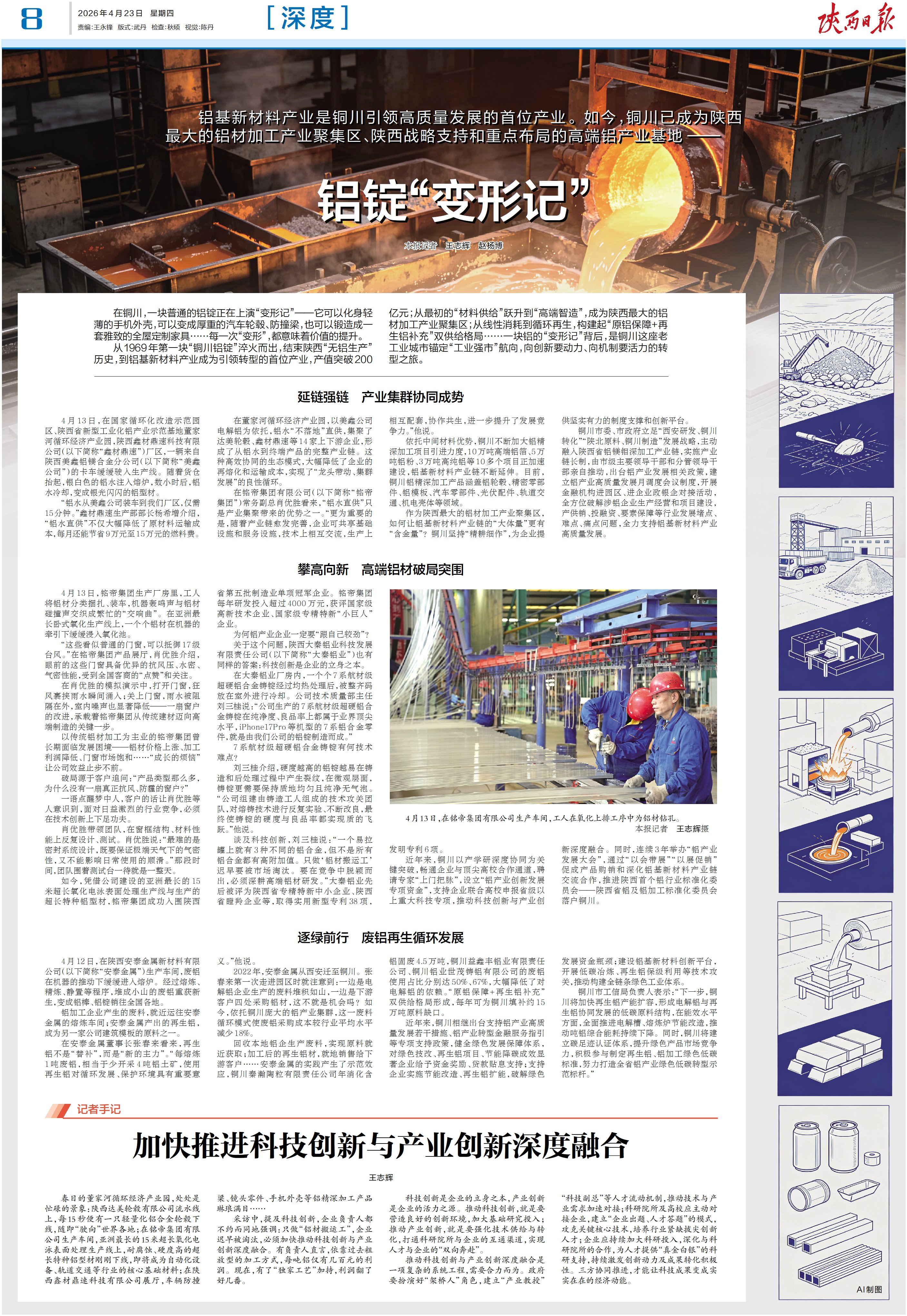 从1969年第一块“铜川铝锭”淬火而出,结束陕西“无铝生产”历史,到铝基新材料产业成为引领转型的首位产业,产值突破200亿元;从最初的“材料供给”跃升到“高端智造”,成为陕西最大的铝材加工产业聚集区;从线性消耗到循环再生,构建起“原铝保障+再生铝补充”双供给格局……一块铝的“变形记”背后,是铜川这座老工业城市锚定“工业强市”航向,向创新要动力、向机制要活力的转型之旅。