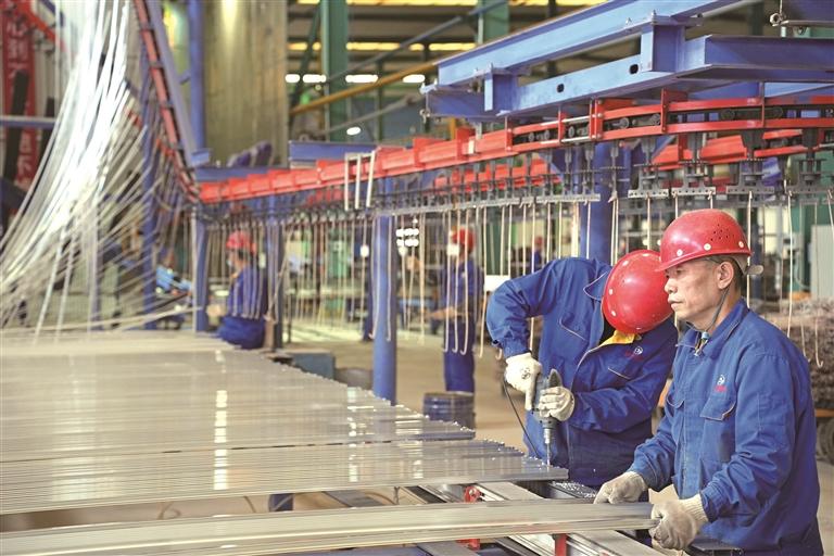 4月13日,在铭帝集团有限公司生产车间,工人在氧化上排工序中为铝材钻孔。 本报记者 王志辉摄
