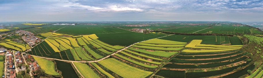 4月18日,宝鸡市陈仓区周原镇的千亩梯田上,油菜花竞相盛放。从空中俯瞰,一层层明艳的金色花海顺着川塬地势蜿蜒铺展,与乡间的村落、田埂和谐相融。 本报通讯员 赵彬瑞摄