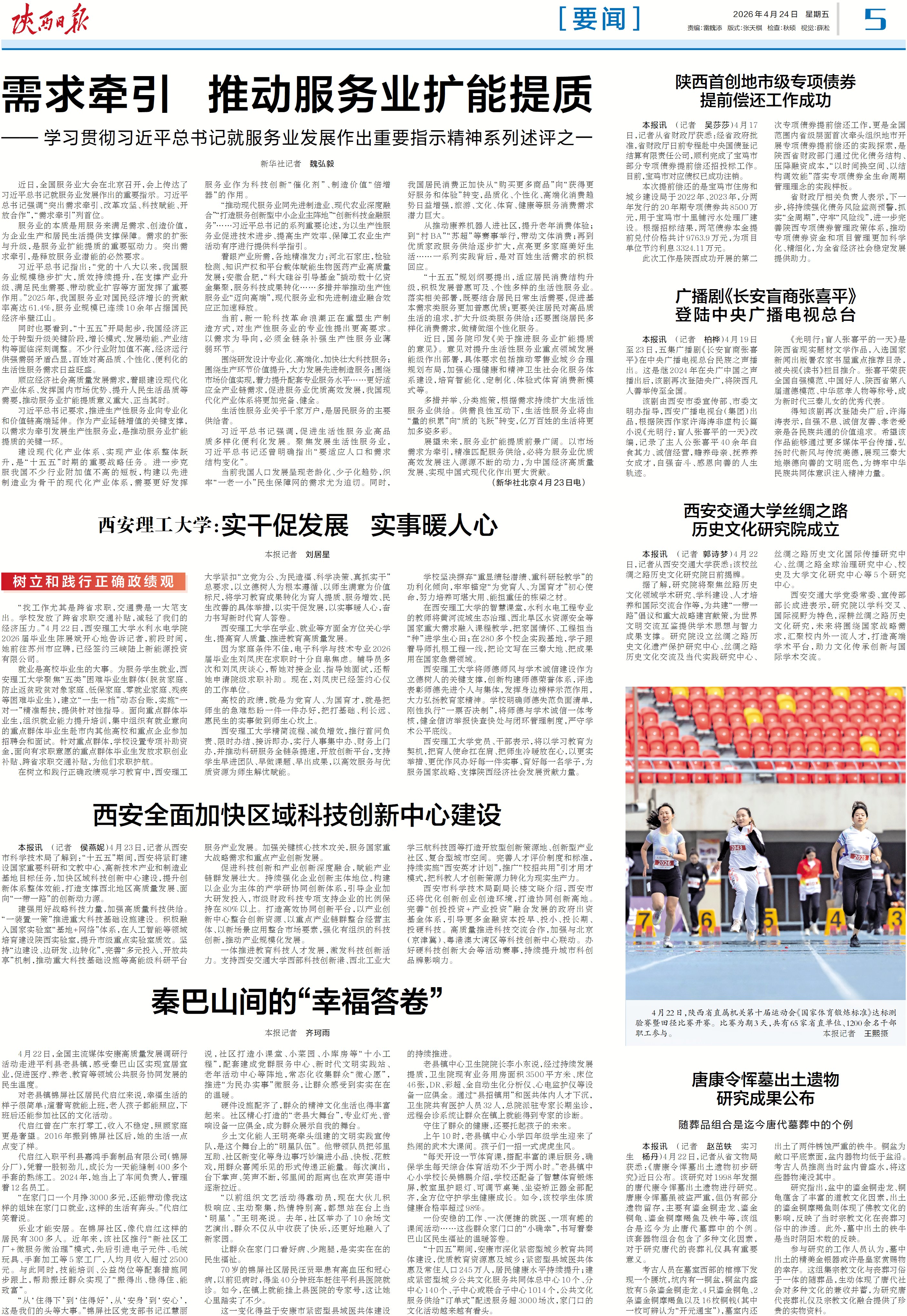 一体推进教育科技人才发展,激发科技创新活力。支持西安交通大学西部科技创新港、西北工业大学三航科技园等打造开放型创新策源地、创新型产业社区、复合型城市空间。完善人才评价制度和标准,持续实施“西安英才计划”,推广“校招共用”引才用才模式,把科教人才创新策源力转化为现实生产力。