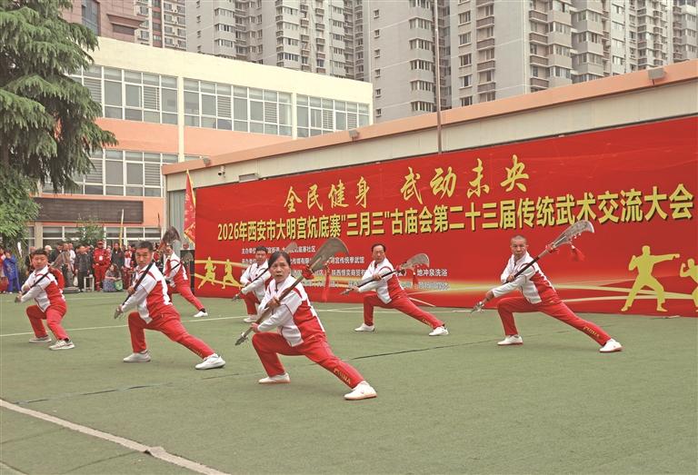 暮春上巳,武魂激荡;大明宫畔,文脉悠长。4月19日,恰逢上巳佳节,“全民健身 武动未央”2026年西安市大明宫炕底寨“三月三”古庙会第二十三届传统武术交流大会在西安市未央区盛大举行。这项扎根乡土、连续举办多年的民间武术盛会,会聚西安各地武术名家、传承人及广大武术爱好者,以传统武学展演传承中华武术精粹,让流传千年的尚武民风扎根民俗沃土,焕发出新的生机。