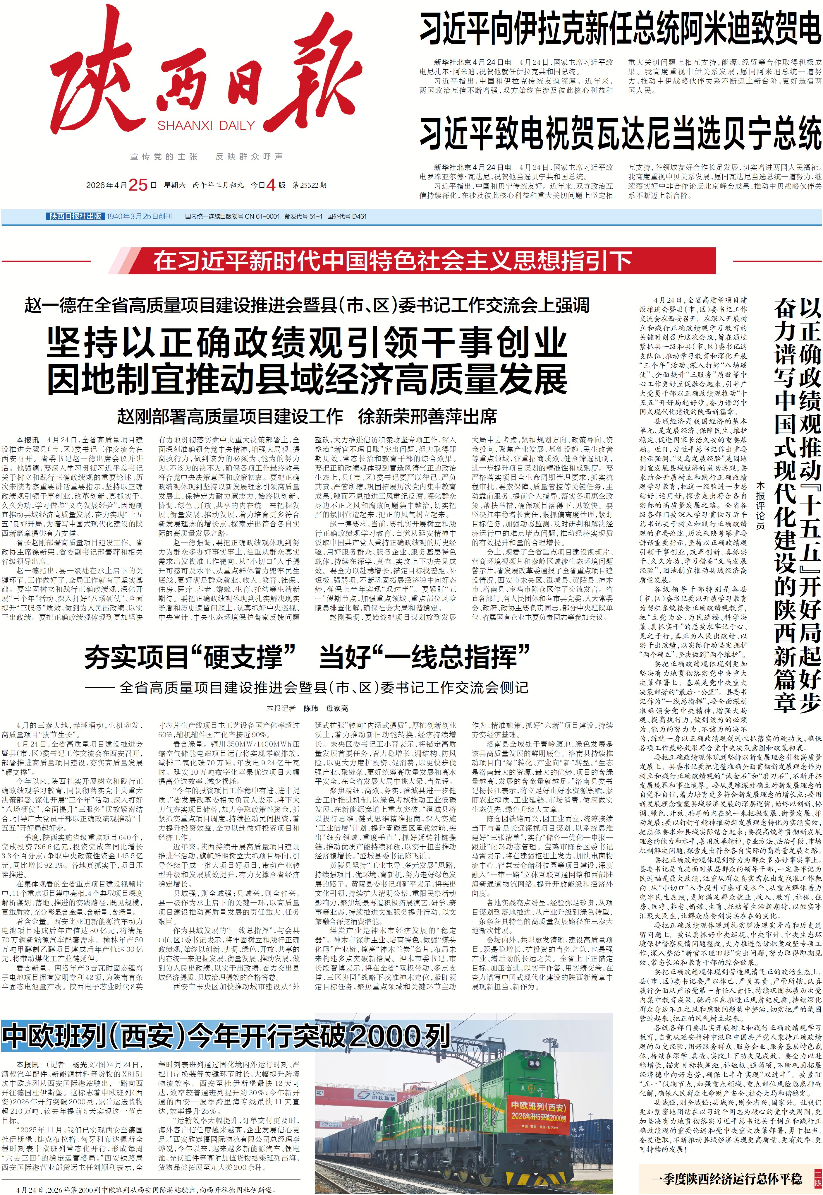 本报讯 4月24日,全省高质量项目建设推进会暨县(市、区)委书记工作交流会在西安召开。省委书记赵一德出席会议并讲话。他强调,要深入学习贯彻习近平总书记关于树立和践行正确政绩观的重要论述、历次来陕考察重要讲话重要指示,坚持以正确政绩观引领干事创业,改革创新、真抓实干、久久为功,学习借鉴“义乌发展经验”,因地制宜推动县域经济高质量发展,奋力实现“十五五”良好开局,为谱写中国式现代化建设的陕西新篇章提供有力支撑。
