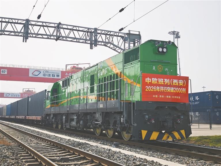 本报讯 (记者 杨光文/图)4月24日,满载汽车配件、新能源材料等货物的X8151次中欧班列从西安国际港站驶出,一路向西开往德国杜伊斯堡。这标志着中欧班列(西安)2026年开行突破2000列,累计运送货物超210万吨,较去年提前5天实现这一节点目标。