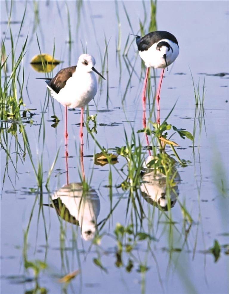 4月25日,陕西黄河湿地省级自然保护区大荔段生机盎然。黑翅长脚鹬、白鹭、苍鹭等水鸟成群栖息,呈现人与自然和谐共生的美丽图景。